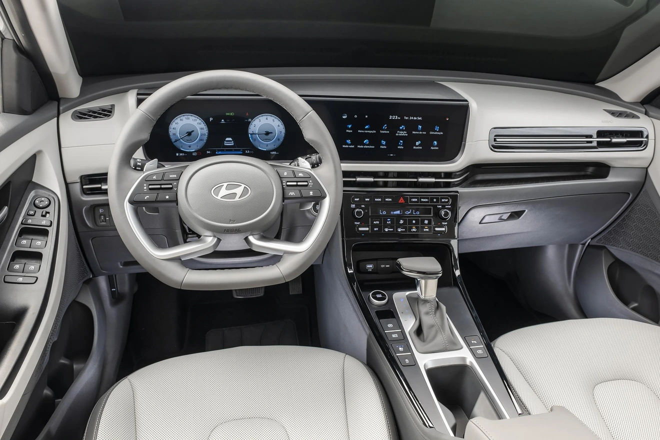 Bước vào bên trong, sự chú ý được đổ dồn vào cặp màn hình có kích thước lên đến 10,25 inch nối liền với nhau và cong nhẹ về phía người lái, hỗ trợ kết nối Apple CarPlay/Android Auto. Đáng mừng là Creta 2025 vẫn duy trì cụm phím bấm điều khiển một số chức năng âm thanh và điều hòa tự động 2 vùng độc lập (tăng 1 vùng so với phiên bản tiền nhiệm).